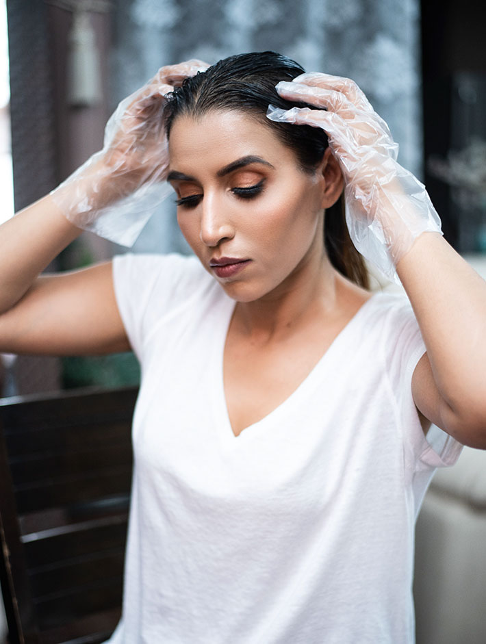 Once the mixture is ready, creamy and without lumps, wear the gloves and immediately start applying it on your hair.