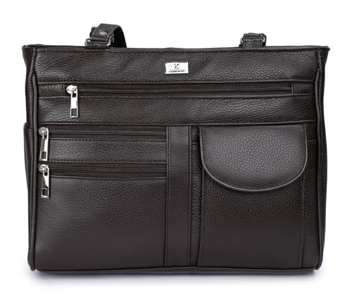 K London Women’s Leather Shoulder Handbag with Multiple Zippered Compartments, Brown, Silver Hardware