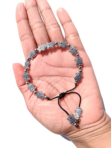 Owl Theme Silver Beads Bracelet with Black Strings for Women and Girls