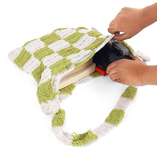 UpTown Folks Handmade Crochet Handbag for Girls & Women – White & Green Checkered Design, Lightweight & Spacious for Beach, Picnic & Everyday Use.